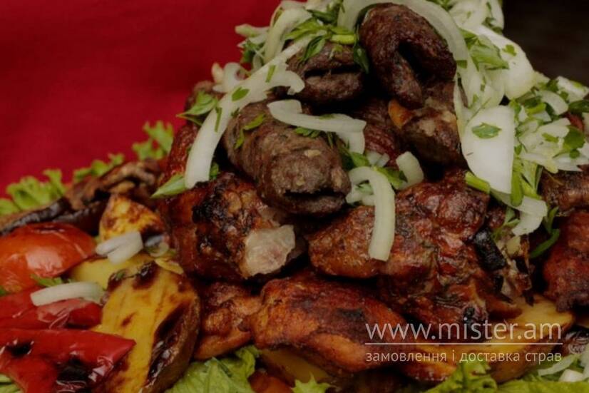 Шашлик зі свинини, шашлик з курячого стегна, люля-кебаб з телятини, люля-кебаб з телятини з сиром сулугуні, курячий люля-кебаб, овочі на мангалі, картопля на мангалі, маринована цибуля та два соуси: сацебелі та ткемалі. Вказана вага сирої страви.
