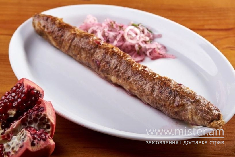 Класичний грузинський люля-кебаб з рубленої баранини. Подаємо з пікантною цибулею, маринованою в спеції сумах. Вказана вага сирої страви.