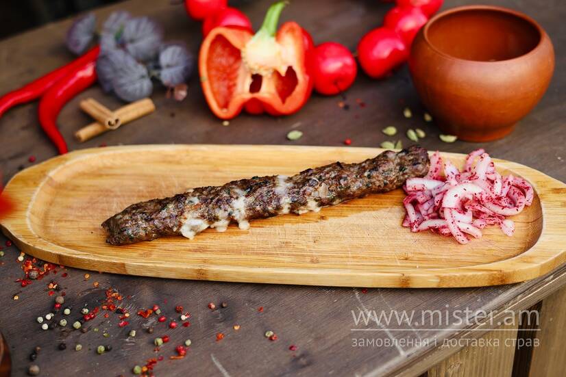 Класичний грузинський люля-кебаб з рубленої телятини та сиром сулугуні. Подаємо з пікантною цибулею, маринованою в спеції сумах. Вказана вага сирої страви.
