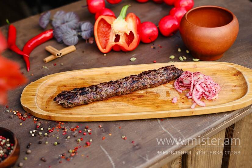 Класичний грузинський люля-кебаб з рубленої телятини. Подаємо з пікантною цибулею, маринованою в спеції сумах. Вказана вага сирої страви.