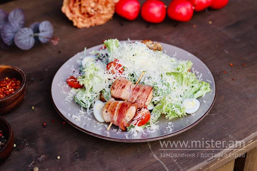 Грузинська інтерпретація класичного салату Цезар. Куряче філе в беконі, грінки, листя салату, яйце, томати черрі, пармезан, соус Цезар.