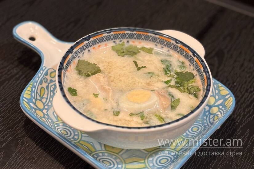 Курячий бульйон, загущений яйцем з курячим філе, перепелиним яйцем та ароматною зеленню.