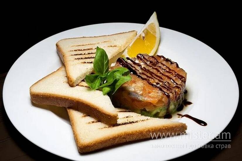Це витончена гастрономічна композиція, яка пробуджує всі почуття. Серце страви – ніжні кубики свіжого лосося, виловленого вручну місцевими рибалками на узбережжі Норвегії сьогодні вранці. Доповнений стиглим авокадо і нотками лимонного фрешу, який освіжає і витончує смак.