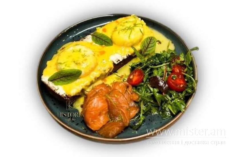 Витончений сніданок зі слайсами ніжного слабосолоного лосося, поєднаний з міксом салату і доповнений яйцем пашот на брускеті.