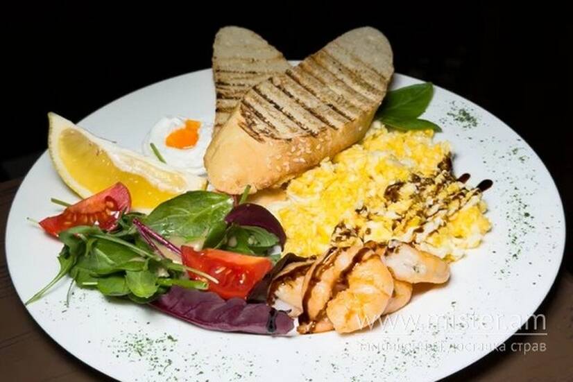 Смажена креветка, хрусткі грінки, ніжний скрембл на вершках з крем-сиром та чері.