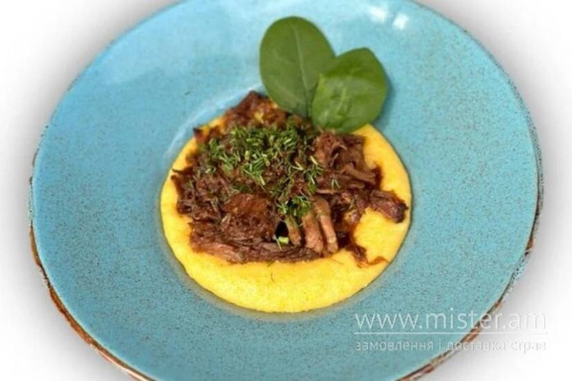 Ніжна кукурдзяна каша з шматочками томленого м`яса з овочами, ситна та смачна страва гуцульської кухні.