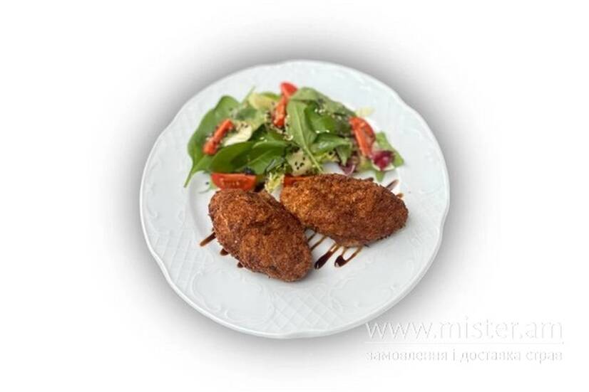Ніжна котлета з двох видів м`яса, з сиром Чеддер та зеленню, непевершено легко та смачно з міксом салату та помідорами чері.