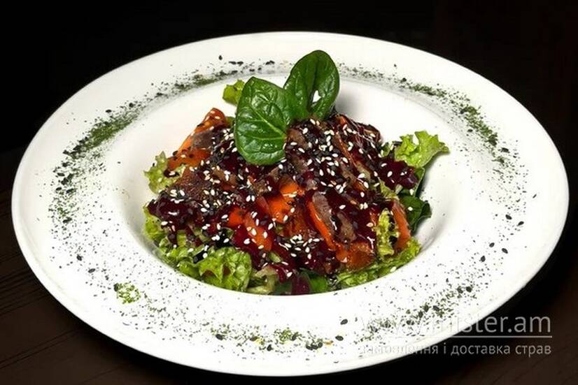 Ніжна смажена телятина з вишневим соусом з міксом салату та овочами.