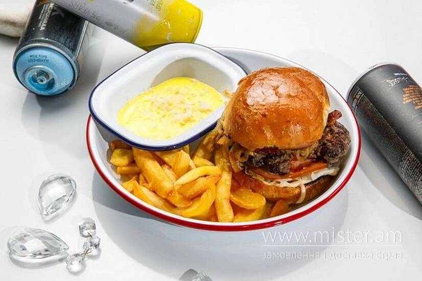 Булку самі робили, котлетос яловичий, хрусткий бекон, сир чедер, свіжий томат, салат Айсберг, огірок маринований, цибулевий джем, фірмові соуси: BBQ та часниковий + хрусткі картопляні діпи.