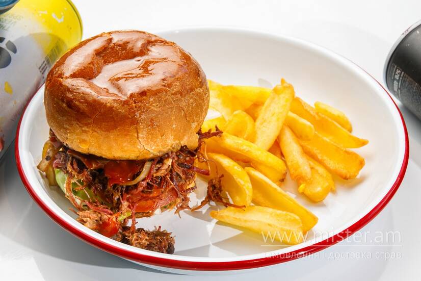 Булку самі робили, рвана яловичина, бекон, свіжий томат, салат Айберг, цибуля біла, огірок маринований, фірмові соуси: сливовий BBQ та часниковий + хрусткі картопляні діпи.