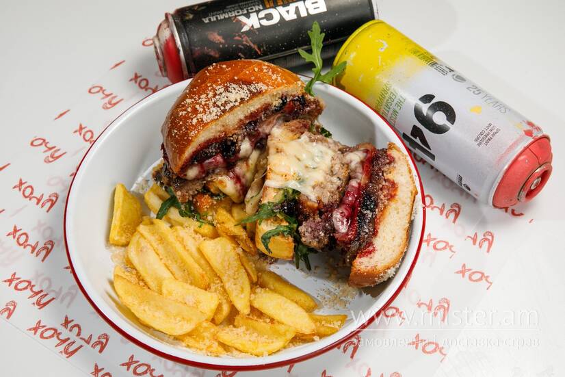 Булку самі робили, котлетос яловичий, сир камамбер, рукола, варення з смородини, цибулевий джем, фірмові соуси: папрік та часниковий + хрусткі картопляні діпи.