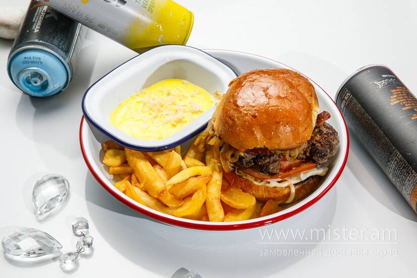 Булку самі робили, котлетос яловичий, хрусткий бекон, сир чедер, свіжий томат, салат Айсберг, огірок маринований, цибуля біла, фірмові соуси: сливовий BBQ та часниковий + хрусткі картопляні діпи + сирна ванна.