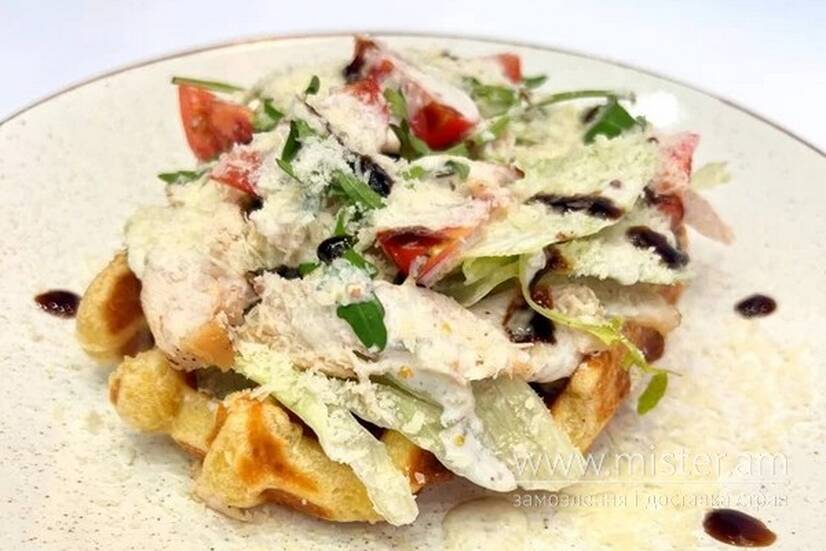 Бельгійська вафля, куряче філе, соус "Цезар", салат Айсберг, черрі, пармезан.