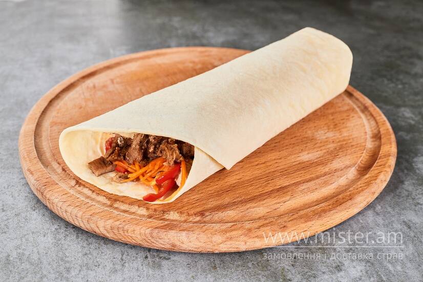 Курка гриль, перець болгарський, помідори, корейська морква, зелена цибуля, зелень, соус та творожна начинка.