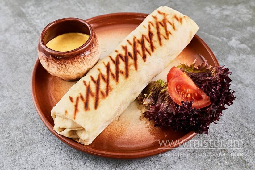 Паляничка печена, соус мексиканський, телятина гірос, помідори свіжі, сир, зелень.
