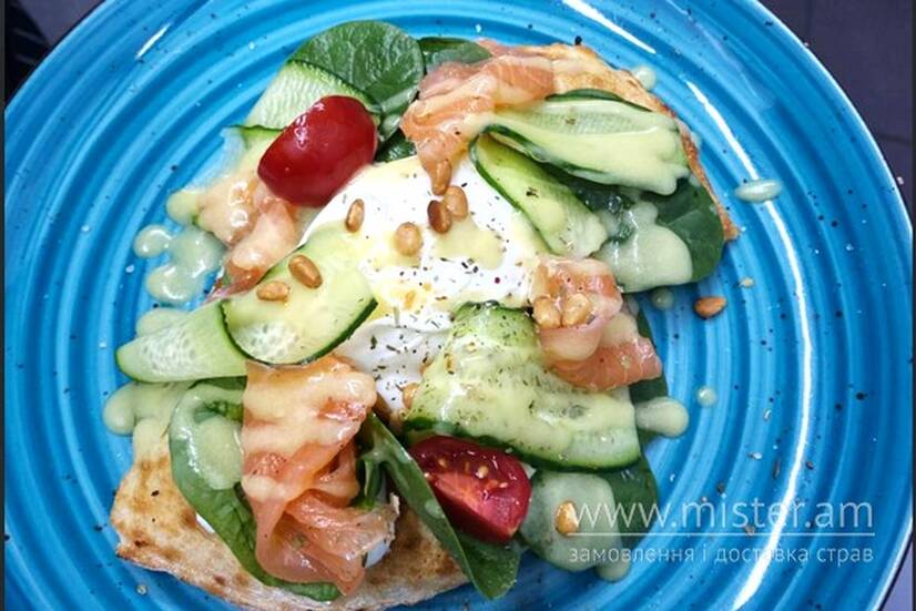 Яйце куряче, лосось, пармезан, горіх кедровий, шпинат, помідор чері, огірок, фета, італійська фокача.