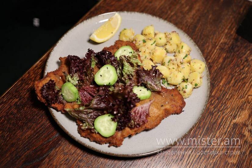 Телятина вирізка, лимон, картопляний салат, петрушка, мікрогрін, мікс, шпинат, огірок.