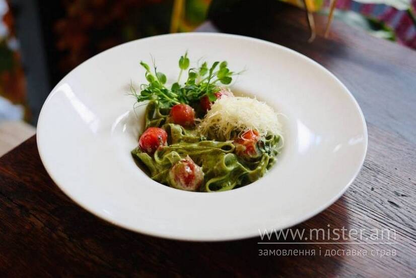 Спагетті, помідор чері, вершки, мікрогрін, пармезан, шпинат, сіль.