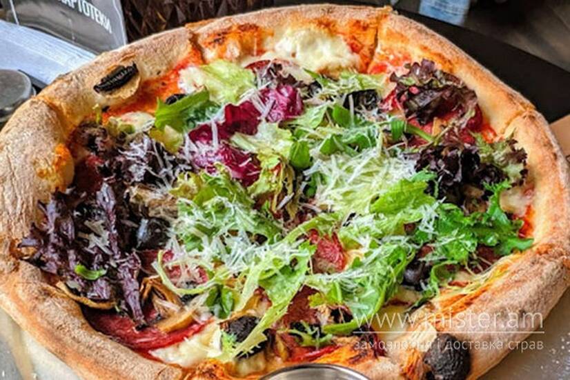 Салямі, печериці, мікс салатів, моцарела, маслини.