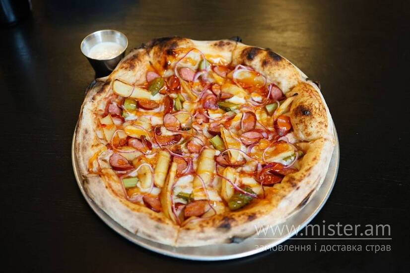 Моцарела, мисливські ковбаски, картопляні діпи, корнішони, цибуля, солодкий чилі.