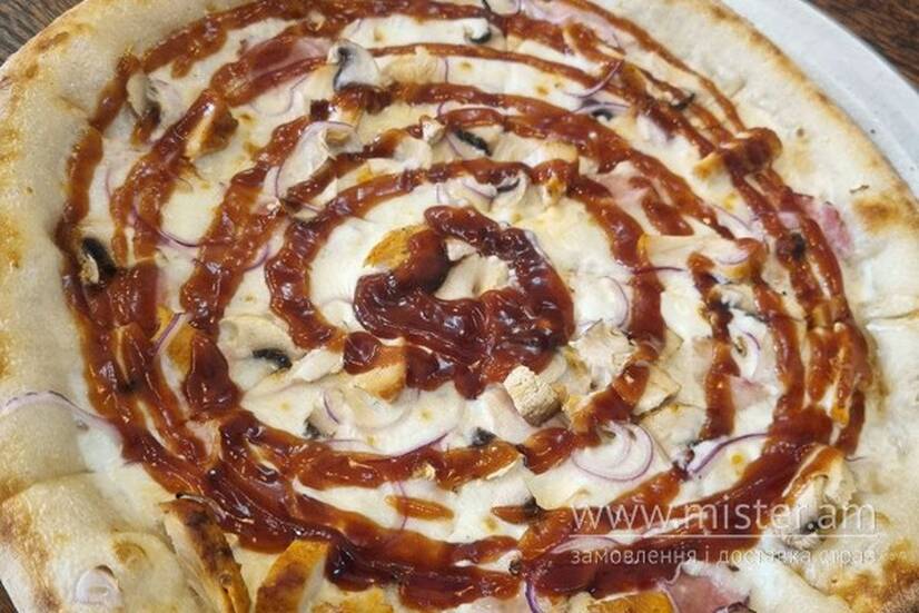 Бекон, куряче філе, моцарела, печериці, цибуля.