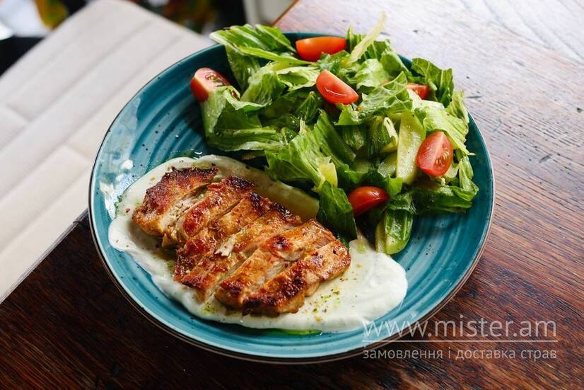 Огірок, помідор чері, куряче філе, салат Ромен, олія оливкова.
