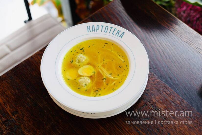Локшина яєчна, яйце перепелине, кріп, морква, кабачок, сіль, фрикадельки, курячий бульйон.