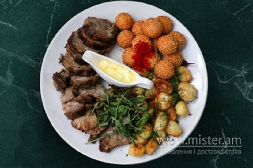 Запечена свинина з картоплею та сирними кульками, соус "Барбекю".
