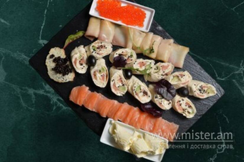Солене лосось філе масляної, роли з лаваша з лососем та крем-сиром, масло, червона ікра.