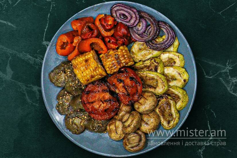Кабачок, баклажан, перець, шампіньйон, кукурудза і цибуля.