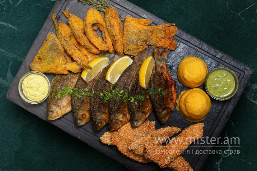 Короп смажений в кукурудзяній муці, скумбрія з зеленню та мамалигою, телапія у кунжуті з фірмовим соусом