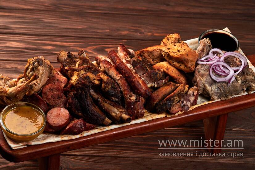 Ковбаски, ребра, куряче філе, ковбаса домашня, шия свинна, лаваш, соуси.