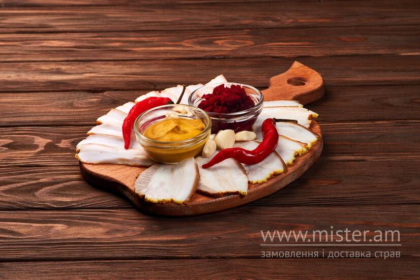 Сало варене, сало солене, хрін, гірчиця, часник, перець стручковий.