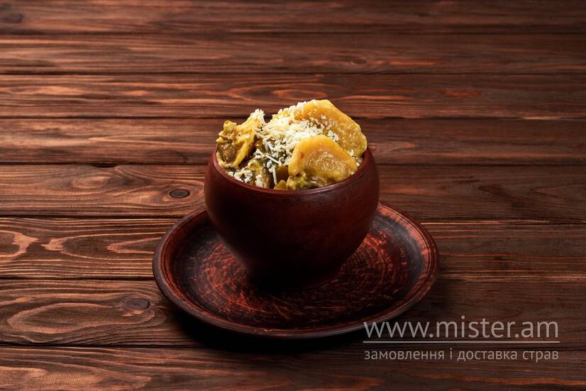 Вареники з картоплею, гриби в сметані, соус, бринза овеча.