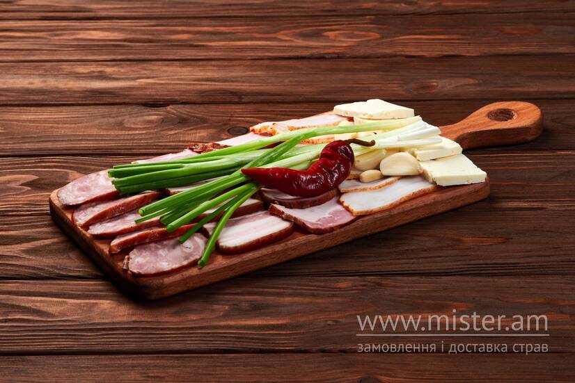Сало, підчеревина, балик, ковбаса, бринза, цибуля, часник, аджика/хрін/гірчиця.
