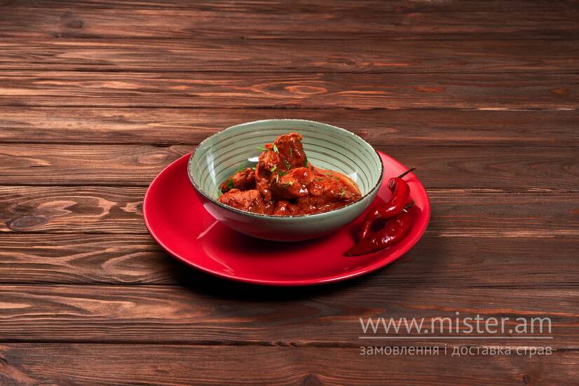 М`ясо свинини, згорені овочі, бандолі, соус томатний.