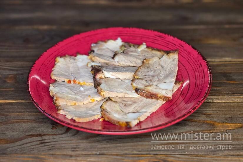 Cвинина запечена зі спеціями. Увага! Вагова страва, ціна вказана за 100 г, кінцеву вартість заклад узгодить з Вами по телефону.