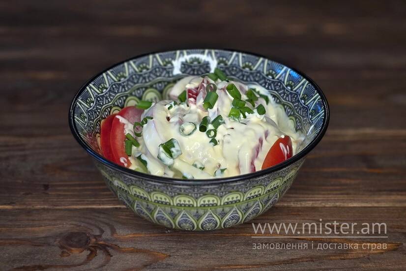 Свіжі огірки, томат, олія/сметана.