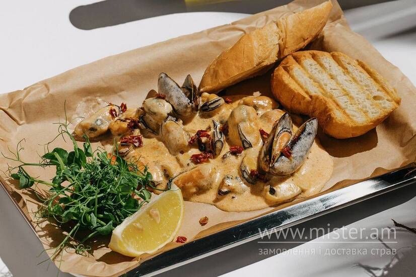 Мідії, вершки, пармезан, спеції, зелень, томати черрі, лимон, масло вершкове, часник, паприка солодка, багет.
