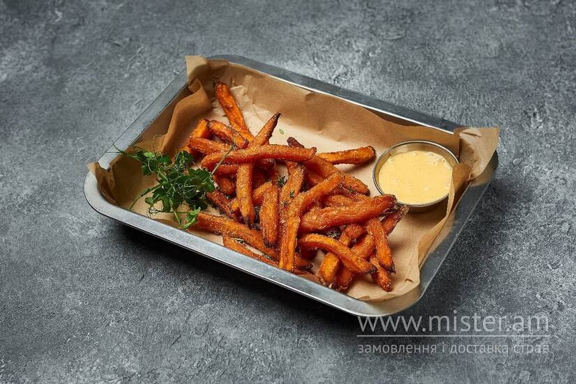 Солодка картопля батат, сирний соус (молоко, чеддер, крохмаль кукурудзяний), зелень.