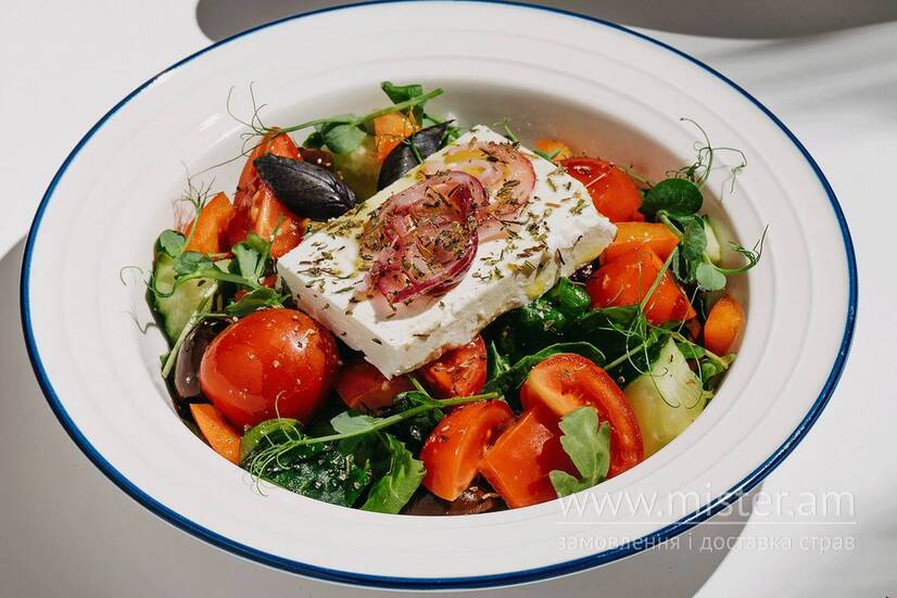 Мікс салату, томати черрі, огірки, перець болгарський, оливки каламата, цибуля червона маринована, фета, прованські трави, оливкова олія, зелень.