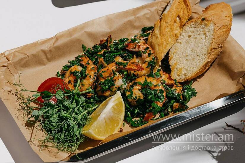 Креветки, зелень, часник, сіль, лимон, томати черрі, масло вершкове, багет.