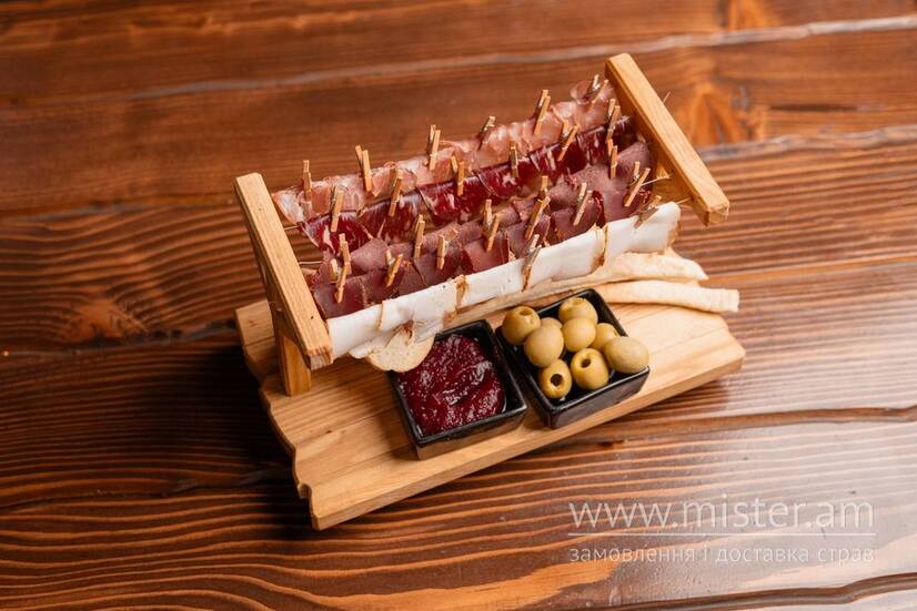 Брускети з мамалига фрі з лососем в азійському соусі.