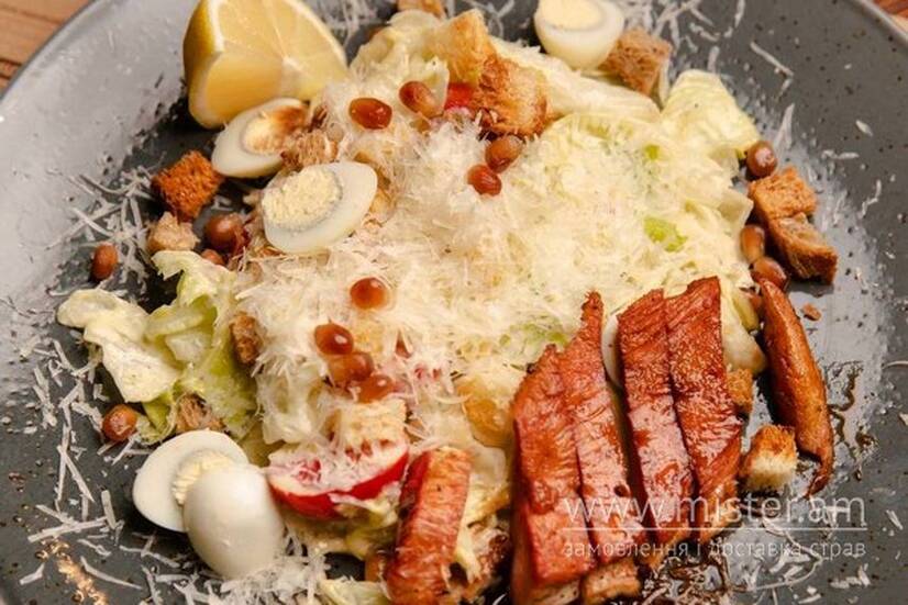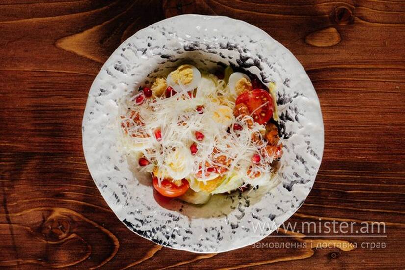 курка обсмажується в гранатовому соусі, айзберг, перепелині яйця, чері, пармезан