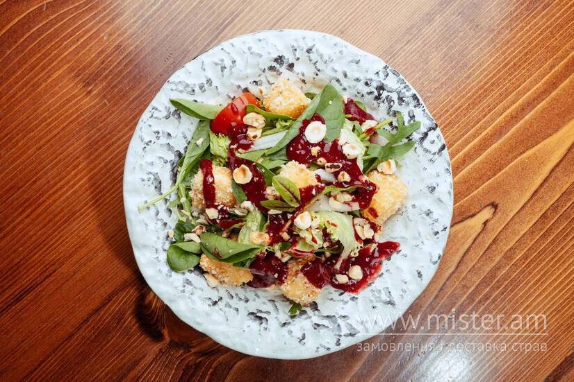 Сир брі в панко, соус на основі ягід, мікс салату, фундук, томаті чері, груша.