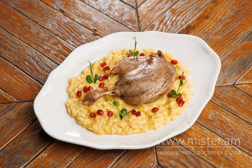 Томлена качина ніжка, цибуля, вино біле, вершкове масло, пармезан, гарбуз, гранат.