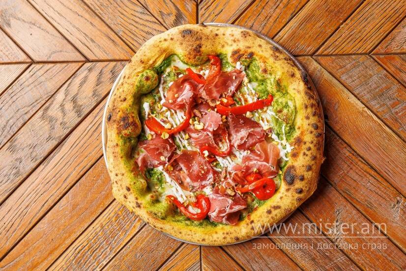 Коппа, соус шпинатний, соус фета, печений перець, фісташка.