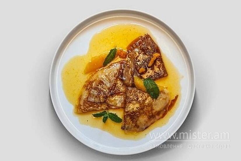 Тонкі млинці, просочені апельсиновим соусом із додаванням лікеру.