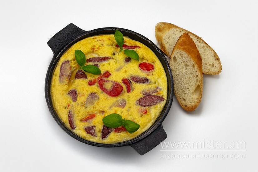 Ніжний пухкий омлет, готуємо з яєць та вершків; додаємо єгерські (напівкопчені) ковбаски та томати чері.