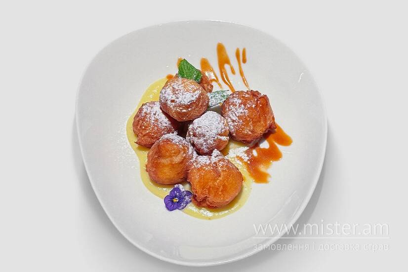 Французькі пончики Беньє, що готуються у фритюрі. Подаємо з кремом Франжипан (горіховий крем з мигдалем) та посипаємо цукровою пудрою.